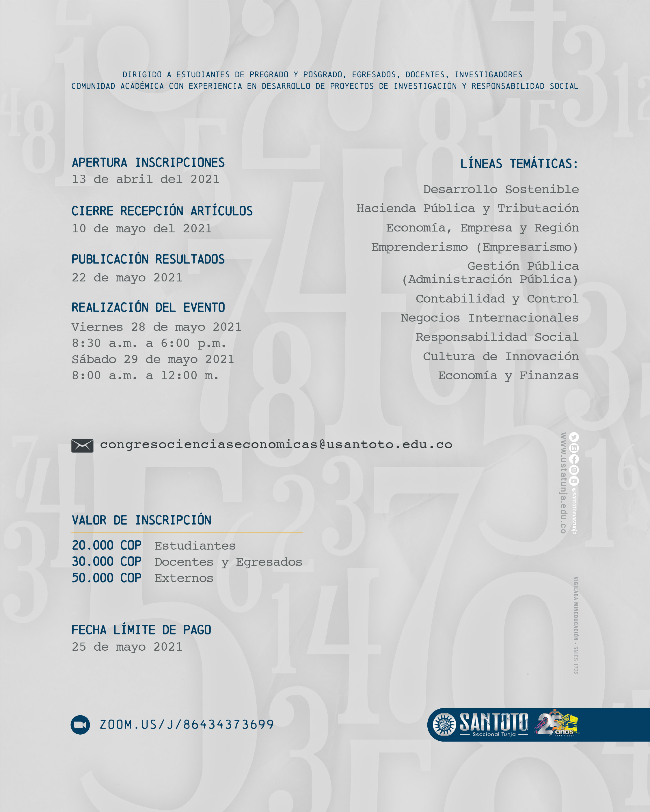 El viernes 28 y Sábado 29 de Mayo se realizó vía conexión zoom, el primer congreso internacional de ciencias económicas Administrativas y contables, organizado por las facultades de Negocios internacionales, contaduría pública y Administración de Empresas, al evento asistieron más de 300 personas incluyendo Docentes, Estudiantes y profesionales de las áreas Sociales, participando activamente otros países como Hungría, México, Argentina y por supuesto en su mayoría, Colombia.
