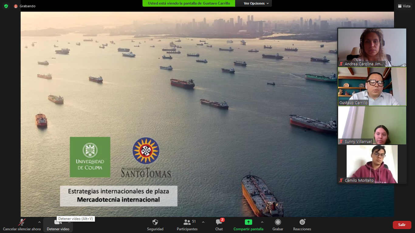 Este proceso se contactó inicialmente a través de la DRI de la Santoto Tunja, donde se tuvo la oportunidad de trabajar por alrededor de 4 semanas, con el Maestro Gustavo Carrillo, con quien en trabajo en equipo hicimos la preparación y planeación de las temáticas de Estandarización Vs Adaptación y Estrategias de Plaza internacional, buscando por un lado identificar las principales estrategias de producto para penetrar mercados internacionales desde la óptica académica colombiana y mexicana, y por otro determinar la perspectiva de la determinación de las estrategias de plaza para la penetración de mercados desde la óptica colombiana y mexicana. Dando como resultado no solo un acercamiento académico y de aprendizaje desde metodologías combinadas, sino el relacionamiento internacional que se generó durante las sesiones.